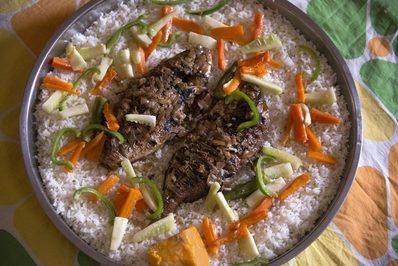 شاید فکر کنید غذای پیچیده ای است و پختن و خوردن آن دردسر دارد. ولی درواقع غذای خیابانی به شمار می رود و در جاهای مختلف شهر داکار آن را می فروشند. محلی ها به خوبی بلندند چطور بشقاب های شان را پر کنند و همزمان شروع به خوردن کنند.