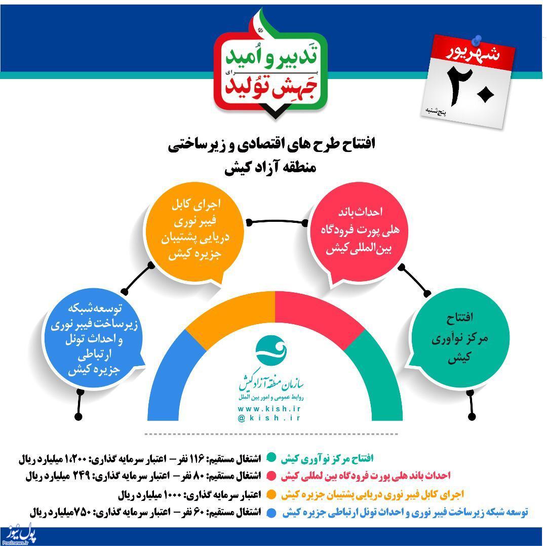 افتتاح پروژه های: مرکز نوآوری کیش؛ هلی پورت فرودگاه بین المللی کیش؛ توسعه شبکه زیرساخت فیبر نوری و احداث تونل ارتباطی، کابل فیبر نوری دریایی پشتیبان