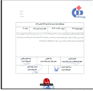 این صورتجلسه به امضای ابراهیم عباسی، رئیس هیات مدیره، سید مجبتی عطری، سید داوود حسینی و فرشید جوان آملی رسیده است.