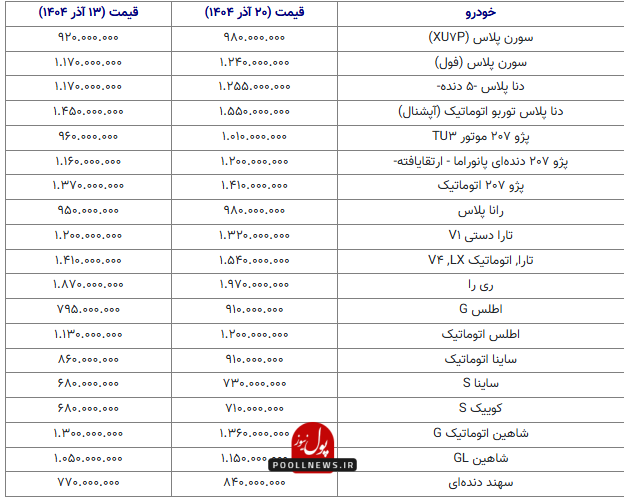 به گزارش پول نیوز ، بر اساس تازهترین گزارشهای منتشر شده از بازار خودرو، قیمت اغلب خودروهای داخلی در هفته منتهی به ۲۰ آذر ۱۴۰۴ نسبت به هفته گذشته افزایش یافته است. این روند صعودی در برخی مدلها بیش از ۱۰ درصد گزارش شده و نشاندهنده تداوم افزایش قیمتها در بازار خودرو است.