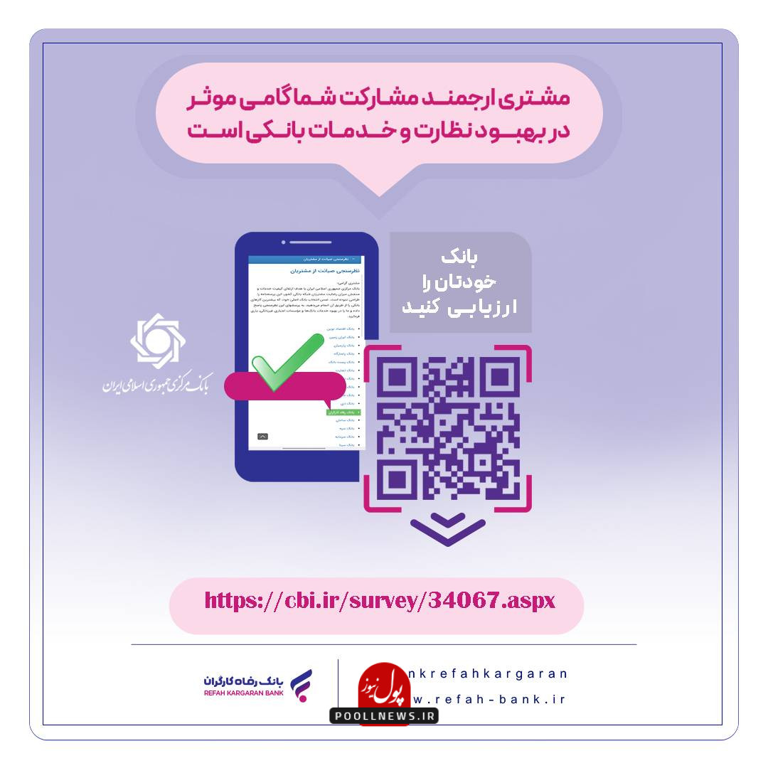 مشتریان بانک رفاه کارگران میتوانند از طریق لینک زیر در نظرسنجی شرکت کنند: نظرسنجی صیانت از مشتریان