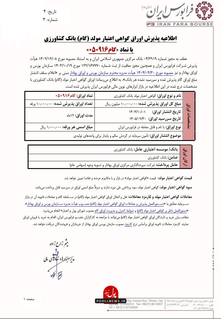 به گزارش پول نیوز ، بر اساس اطلاعیه فرابورس ایران، اوراق گواهی اعتبار مولد بانک کشاورزی در بازار ابزارهای نوین مالی فرابورس ایران پذیرش شده است. این اوراق با هدف تامین سرمایه در گردش سالم و پایدار برای واحدهای تولیدی منتشر می شود.