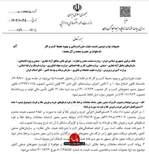 طبق مصوبه این هیئت، پروانه کسب سامانه معاملات برخط طلای آبشده و مصنوعات طلا و جواهر از فهرست مجوزهای صنفی کشور حذف خواهد شد.