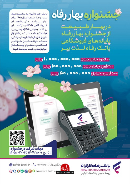 به گزارش پول نیوز ، به نقل از روابط عمومی بانک رفاه کارگران، این جشنواره به مناسبت عید نوروز 1405 برگزار میشود و بانک از این طریق به قید قرعه جوایزی تا سقف 100 میلیون تومان به پذیرندگان برتر اعطاء میکند.