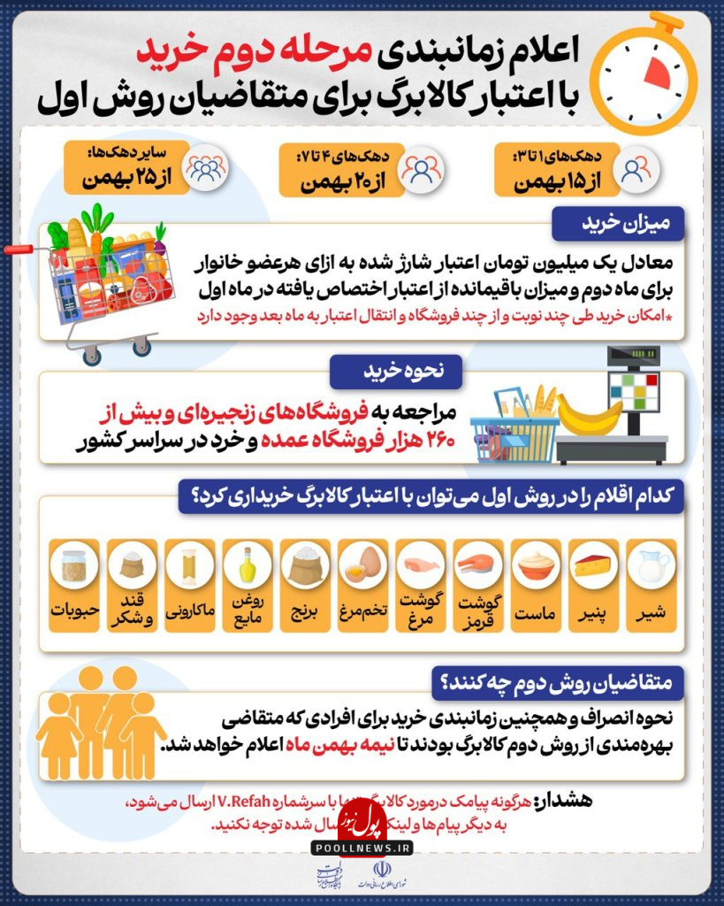به گزارش پول نیوز ، «دهکهای ۴ تا ۷ از ۲۰ بهمن و سایر خانوارها از ۲۵ بهمن میتوانند به فروشگاهها مراجعه کنند. در صورتی که اعتبار هر ماه بهطور کامل استفاده نشود، مانده، به ماههای بعد منتقل خواهد شد و هموطنان از این بابت نگران نباشند.