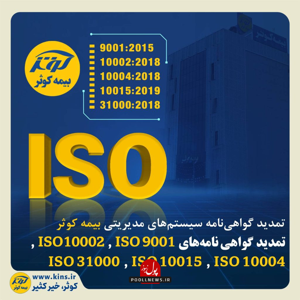 در ایران 30 شرکت بیمه و دهها کارگزاری و اپلیکیشن در مورد بیمه فعال هستند که هر کدام به فراخور جایگاهی که دارند، مدارک معتبر داخلی و خارجی را دریافت می کنند که گواهینامه های ایزو نیز از آن دسته است. شرکت بیمه کوثر به عنوان شرکتی که عملکرد درخشانی در این عرصه داشته، گواهینامههای متعددی دریافت کرده که شامل گواهینامه ISO 9001 ، ISO 10002 ، ISO 10004، ISO 10015 و ISO 31000 است. بیمه کوثر با توجه به عملکرد قابل قبولی که در زمینه ارایه خدمات بیمه ای داشته، موفق به تمدید گواهینامه استانداردهای ISO 9001، ISO 31000، ISO 10015، ISO 10002 و ISO 10004 شد تا بار دیگر مهر تایید جهانی بر عملکرد خود را ثبت کند.