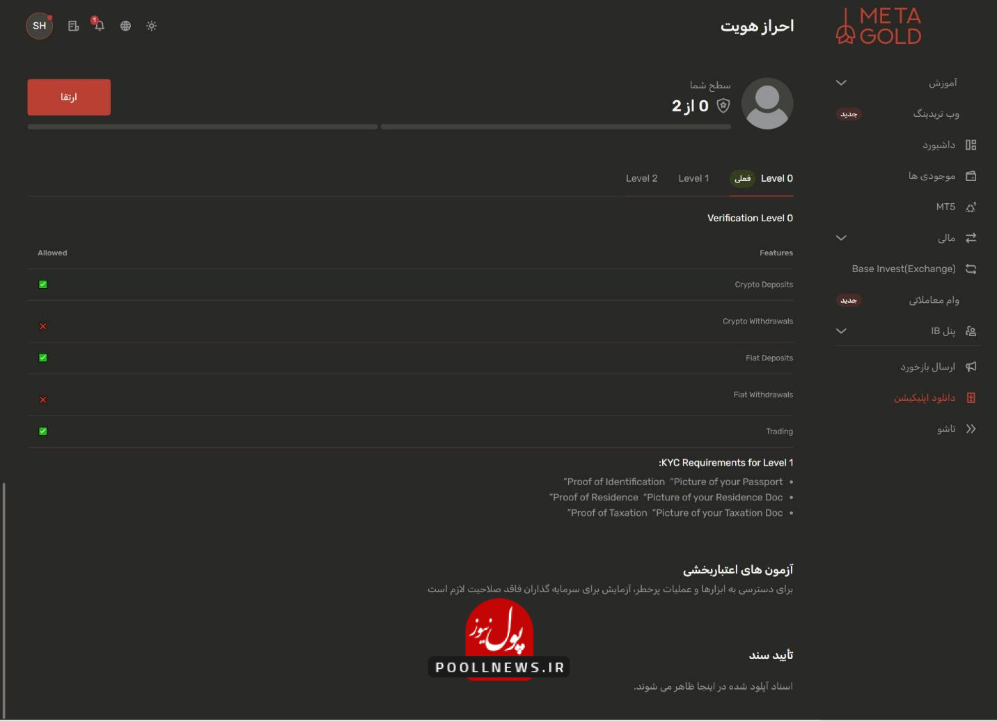 پس از بارگذاری و زدن دکمه “بعدی”، وضعیت مدارک شما در پنل به حالت “در انتظار تایید” تغییر میکند. تیم پشتیبانی متاگلد اطلاعات وارد شده در مرحله اول (نام انگلیسی) را با مدرک آپلود شده تطبیق میدهد. در صورت مطابقت، حساب شما به Level 1 ارتقا مییابد و ایمیل تایید برایتان ارسال میشود.